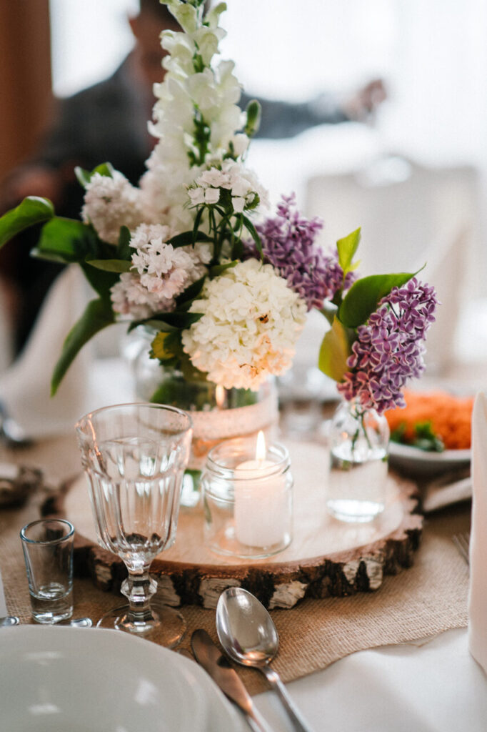 Kwiaty na stołach we flakonach, białe obrusy, pokrowce na krzesła oraz dekorowany stół prezydialny dla Państwa Młodych. W Sali Kominkowej dekorowany jest też kominek.